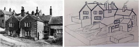 In the late 1600s the properties at Strines would possibly have been similar to the weaver’s cottage described in Chapter 1, but later in the mid 18th century these cottages would have been replaced by more substantial stone buildings. We can get some impression of these structures from buildings still standing in Saddleworth and sketches made by Charles Higson of what was left of the Roebuck Low homestead in 1905 (see above). In sale documents of the Roebuck Low property recorded by the Higsons there is a statement “…compact and capable of being made into 3 Tenements for the occupation of Clothiers, if chose to be so occupy’d.”. In 1786 we know that the clothier John Winterbottom was resident here. In a will of James Lees in 1794 it states that the property is occupied by three tenants (Thomas Winterbottom, Robert Winterbottom and James Wilde). Clearly the homestead could well be described as a tenement divided into individual homes for several different families – something of a halfway house between the individual cottages of earlier times and the terraced housing that would come to dominate Oldham a century later in the Victorian era. My simple interpretation is that the buildings at these Strinesdale homesteads housed not only the families that farmed the surrounding fields, but also a number of clothiers such as John Winterbottom and George Vinge who purchased wool, and turned the wool into finished cloth, and then sold the cloth to various clothes manufacturers. Indeed, it’s possible that John, the clothier, even used the wool provided by his cousin Robert’s sheep.
