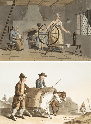 The illustrations on the right give an idea of how the interior of these clothiers’ homes may have looked. In contrast to the weavers’ cottages described in Chapter 1, these dwellings have well-defined fireplaces with chimneys, and the floors are stone rather than earthen. The windows are leaded and much larger at this time, allowing in much more light; something that must have been particularly important for the cloth manufacturing process. Also shown in these sketches are the types of clothing worn in the late 18th and early 19th centuries by the manufacturing classes. In many ways these haven’t changed much from the clothing in the 17th century – the men still wearing breeches and long stockings, and the women in long skirts with aprons, and small wimples or bonnets holding in their hair (see Chapter 1). The wealthy clothiers perhaps differentiated from the labouring classes by their smart waistcoats, topcoats and better quality leather shoes.