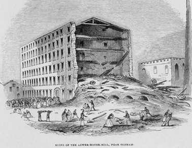 The same banns reveal that Sarah herself was a weaver employed by Radcliffe’s, and not far from Bottom o’ th’ Moor was Lowerhouse Mill (on what is now Barry street) which was owned by Samuel Radcliffe. The simplest interpretation is that Sarah worked at Lowerhouse Mill, a mill that just 11 years before her marriage had experienced a disaster that had been the subject of a Royal Commission. In 1844 an extension was being added to the existing mill (built 1821-4) when a ceiling beam gave way and the whole of the extension collapsed killing 20 people (see picture above). Three of the individuals killed were from the same family. The Illustrated London News reported that “Mary Tweedale… stated that one of the bodies lying at her house was that of her husband [Joseph, overlooker]; he was forty-four years of age. Another body…that of…Robert Tweedale, her son, aged seventeen years, a twister-in; and the third body…that of James…a younger son…aged twelve years…a reacher-in. The poor woman sobbed, and was quite overcome.” A later reading of the Royal Commission concluded that the high number of fatalities could be explained by the Victorian mill-owners’ practice of putting people to work in the lower floors of their factories as soon as they were habitable, while construction proceeded above (Swailes, 2003).