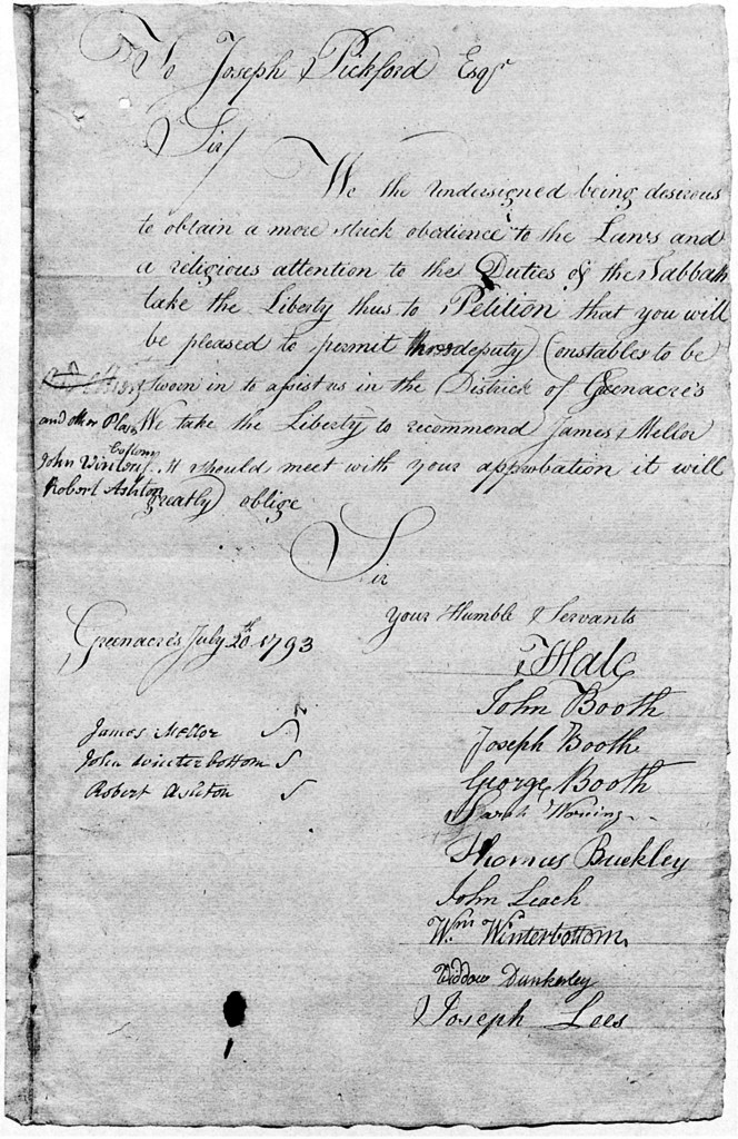 Returning to John Vinge, he is referred to as a weaver in the marriage record, this may reflect a step down from his father’s occupation of clothier or may just show a difference in names used for the same job in official documents. Nevertheless, he is still working in the predominant trade of the region – cloth-making. A trade in which his mother’s family had been involved for at least a hundred years. John would not have known his father who died in 1790 at the young age of 24 when John was just 3 years old. As we have seen in the previous chapters, John would have grown up in very turbulent times. We’ve seen how Oldham experienced a series of food riots throughout the 1790s and early 1800s, and the foothill regions of Greenacres and Saddleworth did not escape these tribulations. In Delph in July 1795 a crowd took all the loaves from a baker’s cart, but sold them at a reduced price, and then handed over the money to the baker. In Greenacres in 1793, the authorities were so worried that they drafted in extra deputy constables, one of whom was a John Winterbottom and another a James Mellor (see Petition, below). Following George Vinge’s death, John’s mother Ann would marry a James Mellor; so, it seems likely that these two new constables were John the son of Robert (Ann’s father’s cousin), and her second husband. This contention is further supported by the fact that a William Winterbottom was both a signatory to the petition and a witness of Ann’s marriage to James Mellor.
