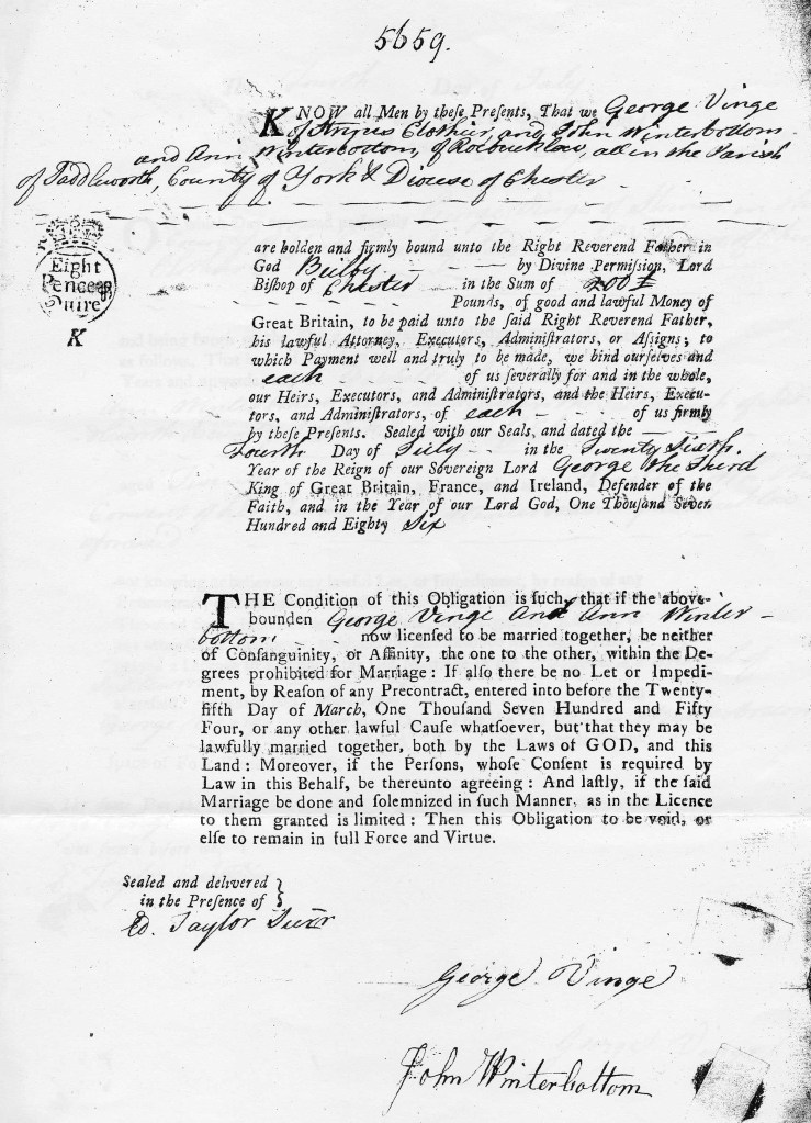 Still, where did this strange middle name come from? It turned out to be his mother’s maiden name. In 1855 George’s father John Thomas married Sarah Vinge at Prestwich Parish church. My search through the census records of 1841 to 1861 revealed that there were only two families, and a single woman, by the name of Vinge in Oldham. The heads of these two families, George and John, and the single woman, Mary, were all siblings, and there wasn’t another Vinge within a 100 miles of Oldham. It turned out that the Vinges of Oldham all descended from a George Vinge who married an Ann Winterbottom at St Chad’s, Uppermill in 1786. Fascinatingly, this marriage was not by banns, as are most marriages, but by licence. This was more commonly used by the better-off in order to keep the marriage out of the public eye. Marriage by licence required someone to promise to pay a bond if the marriage were proven to be illegal (e.g., if either the bride or groom was already married), this meant that it was rarely used by working people. In 1786, the bond (see below) amounted to £200, over £15,000 in today’s money. However, I wonder if this type of marriage was also forced upon Dissenters? The Marriage Act of 1753 stated that all (except Quakers and Jews) had to be married in the Anglican church; thus when the bride was a Non-Conformist (or Roman Catholic), the reading of the banns would not be possible, as the bride would not be a parishioner; thus, the marriage might have to be carried out by licence.