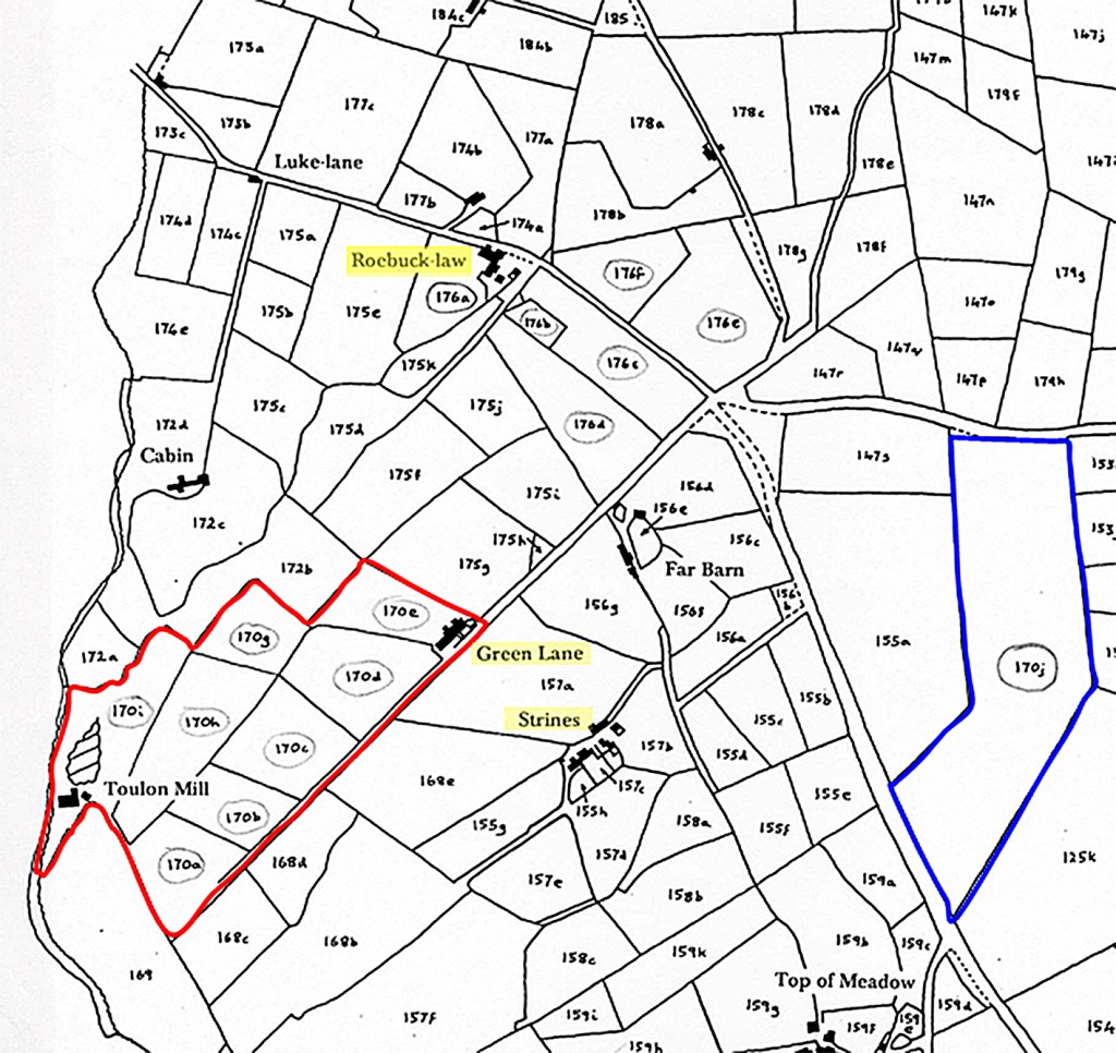 The Winterbottom families of Strinesdale were probably reasonably well-off. In his History of Oldham (1817), James Butterworth states that Greenacres Independent Chapel (the one opened in 1785) contained a vault with a memorial inscription to a Mr. Winterbottom of Green lane (probably the Robert named above who died in 1815). Furthermore, Nightingale (1893) relates that some time before 1775 the new minister of Greenacres Congregational Church, the Rev. Edward Harrison from Swinden-in-Craven, was introduced to the congregation by “Mr. John Winterbottom, of Green lane, a woollen manufacturer, who frequently went to Craven on business matters”. There is also a deed from December 1770 that records an agreement between Abraham Lees (yeoman of Roebuck Low) and John Winterbottom (clothier of Strines) to divert water from a weir at Rovingshead in a drain down Green Lane to John Winterbottom’s dyehouse, and “…to make a pond & erect a turfcoat, dye house, wash houses, etc. on a parcel on N side Green Lane…”. I believe this John Winterbottom is Robert’s father (see John-1 in tree, above). In the tithe map (above), at the far west end of Green lane, can be seen Toulon Mill lying just north of the lane. This mill is not the dyehouse built by John, but one erected by his son Robert (c. 1800); however, probably on the same site.