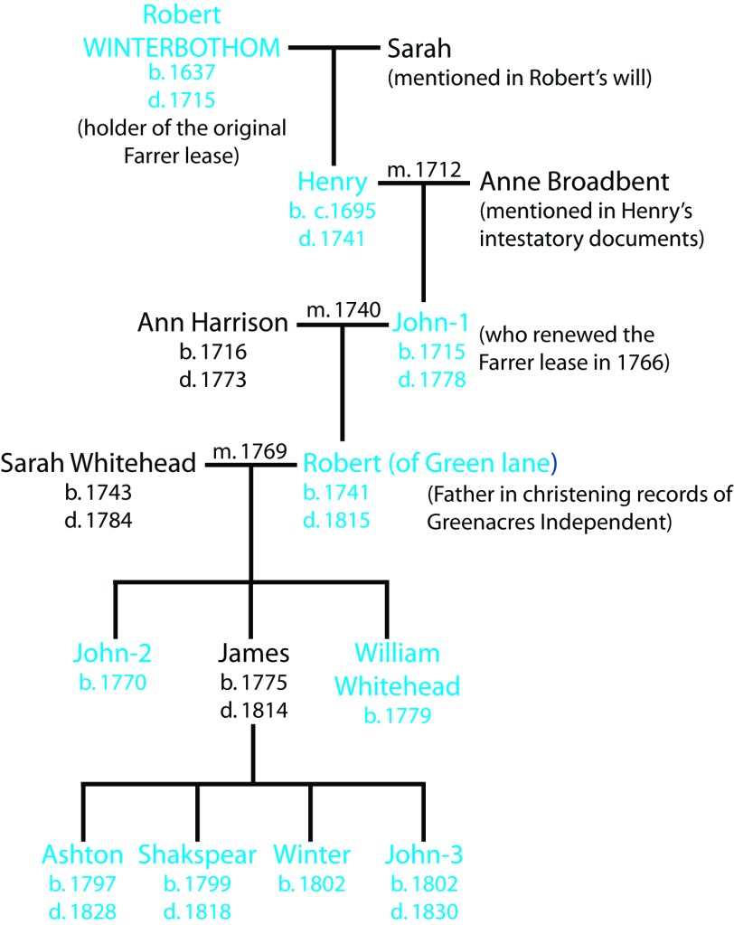 I believe this John Winterbottom is the father of the Robert named in the baptismal records of Greenacres Independent Chapel (i.e., Robert of Green Lane). This thesis is supported by the fact that as stated above a John Winterbtoom left the leasehold of a farmstead in Strines to his son Robert when he died in 1778. Also, the fields listed in John’s 1766 lease are referred to in Robert’s will of 1815 (see Appendix 7) suggesting that Robert inherited these fields from his father, John. Together with a deed of 1801 (see Appendix 8), Robert’s will divides the farmstead and Toulon Mill (see tithe map above) amongst his two sons, John-2 (see tree below) and William Whitehead, and four grandsons – Ashton, Shakspear, Winter and John-3. Finally in the Higson papers (1900-30) it is stated that this farmstead is owned in 1822 by John Winterbottom. However, the 1801 deed shows that John-2 only obtained a third share in the mill (Toulon, aka Holes), and the 1815 will reveals that John-2 was the Testator (or Executor), but was not a beneficiary. The majority of the property was left to Robert’s younger son, William Whitehead Winterbottom, and his grandsons. It’s possible that the John mentioned in the tithe records (and by the Higsons) is taken from the original Indenture of lease that is in the name of John-1 (see Appendix 6). My interpretation of all these data are that the lease originally taken out by Robert (d. 1715) has passed down through Henry, John-1, Robert to William Whitehead and Robert’s grandsons, giving rise to the following minimal family tree tracing the progression of the Green Lane farmstead through the Winterbottom family: