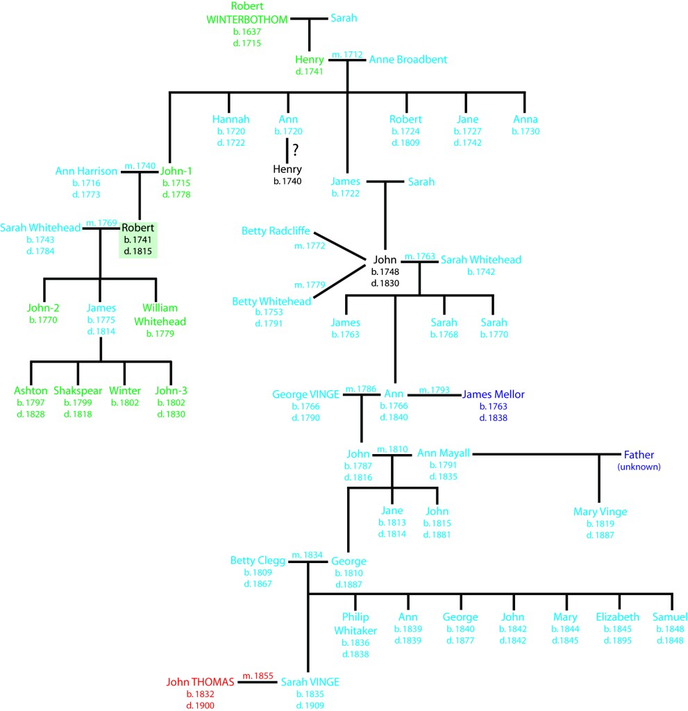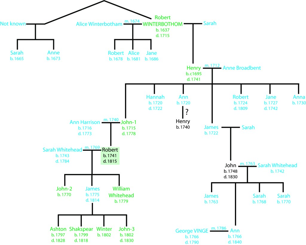 In the records of Saddleworth Parish Church (St. Chad’s), in addition to the formal records, are numerous footnotes that were added by the editor, John Radcliffe (1887-91), many based on the research of the Rev. Raines (1828-78). Included in these footnotes are several pertinent to the Winterbottoms of Strinesdale. In particular, in the record of Ann’s father’s baptism it states that his parents were James (clothier) and Sarah of Delph-Greaves with a footnote that “John Winterbottom of Strines, died 28 January, 1830, in his 82nd year; and Betty, his wife, died 7th June, 1791, in her 38th year” (note: this would have been his third wife Betty Buckley, née Whitehead, not Ann’s mother). John is also referred to as “…of Roebucklow” in these records. As stated above I think that John’s father James is the brother of Robert’s father John-1 (see trees,above and below). This would make John of Roebuck Low and Robert of Green Lane cousins. As to Henry of Gibraltar who also appears in the baptismal records, his relationship to the other two Winterbottoms is not clear. I’ve speculated that he may also be a cousin by an illegitimate birth to one of John’s and Robert’s aunts. An Ann Winterbottom, possibly the sister of John and James, baptized a son called Henry at Oldham Parish church in 1740, the father being named as Henry Holme, a resident of Oldham workhouse. This give rise to the following tree that shows the renters/owners of the Green Lane farmstead in green, and the father’s in the Greenacres Independent baptismal records in black: