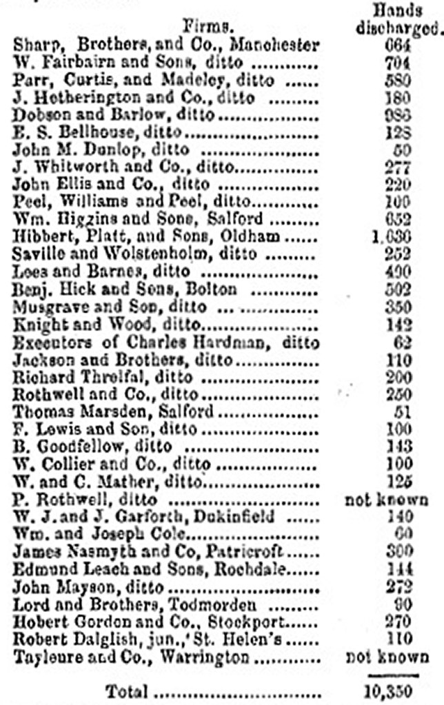 The up-turn in fortunes for the engineering manufacturers also signalled an increase in bargaining power for the artisan mechanics. As a result, there followed several industrial disputes in the period 1850-51 (see Burgess, 1972). In several of these the employers were forced to back down and accept the workers demands, but in April 1851 the workers of Hibbert & Platt pushed just a little too far. The ASE had been pressing the employers to abandon systematic overtime and piece work for some time, and these two demands were presented to Mr. Platt by his work-force in 1851. However, the Oldham engineers also demanded that he lay-off ‘illegal’ men (those who hadn’t undergone apprenticeships) and replace them with apprenticed workers. On May 6th, Platt agreed to end systematic overtime and piece-work, but initially refused to fire the illegal workers. The engineers gave him an ultimatum that they would strike if he didn’t accede to their demands by the 17th. On the 16th an agreement was reached and a strike was averted. However, unbeknownst to the work-force, on the 13th May Platt had met with twenty other major Lancashire manufacturers in Manchester who agreed to form an ‘Association of Employers’ for their ‘mutual aid’.