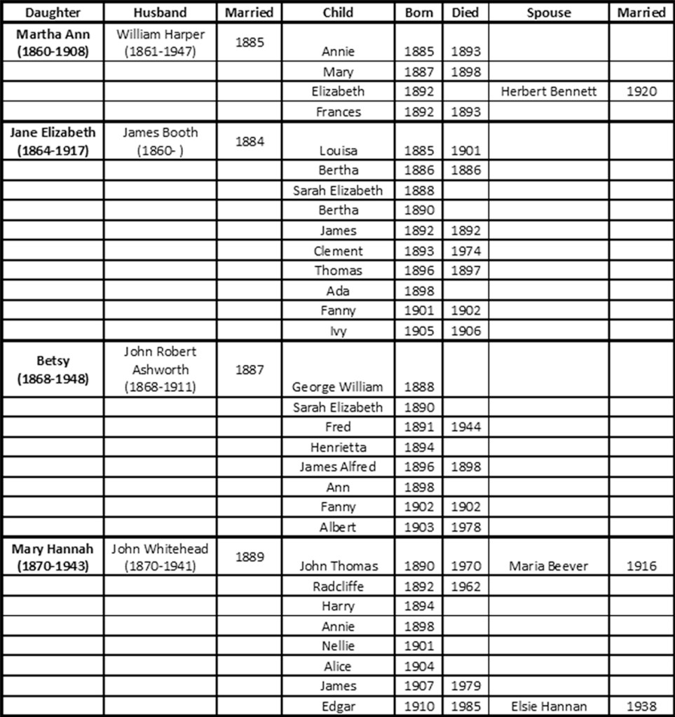 John and Sarah are the first couple in my Thomas line of descent who had female children who went on to marry and have children. In my introduction to this family history I promised not to allow the story to become “…just a dry, chronological list of births, marriages and deaths.”. Nevertheless, I felt I had to include some information on the descendants of John’s and Sarah’s daughters so that those Oldham family historians who have a Thomas in their family tree might find a connection to this story. To prevent boredom for those for which this information is of no interest, I’ve included the majority of the data in table form.