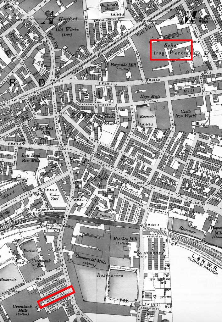 In 1887, the third Thomas daughter, Betsy, married John Robert Ashworth at St James’s Church on Barry street. They would have six children who reached adulthood (see table). In the 1901 census John is described as an ‘iron labourer’. Of course, Betsy’s father was variously described as a ‘mechanic’, ‘iron labourer’ or ‘iron turner’, so perhaps John Thomas and John Ashworth were work colleagues? One of Betsy’s sons, George, would become a moulder at an iron works, maybe following in his father’s footsteps. Considering where the family lived, on the south-western edge of Waterhead, the Ashworth men would have a multitude of employers to choose from, not only Asa Lees, but also the other major machine maker Platt Bros. (Old Hartford Works), the engine makers Buckley & Taylor (Castle Iron Works) and W. B. Haigh & Co. (Globe Iron Works), or several other smaller concerns, e.g. the Star Iron Works of W. Toole on Taurus street.