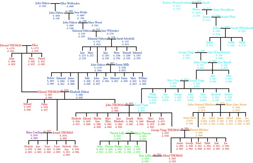 I have tried to keep the narrative in roughly chronological order. So, the first chapter deals with the branch of my family tree (see below) that I’ve managed to trace back furthest in time. The chapter begins at the time of the Restoration (c. 1660) and follows the Dalton family line up to my great, great, great grandmother Elizabeth Dalton’s marriage to Edward Thomas, and the birth of their children around 1830. This chapter is the longest, both in length and in timespan (approx. 170 years). The second chapter covers Edward’s parents arrival in Oldham around 1800, and the division of the Thomas family into two branches, one in Hyde and the other in Oldham. The third chapter travels backwards in time again to the 18th century, to uncover the history of my great, great grandmother Sarah Vinge’s family line, including the marriage of her great grandfather George Vinge in Saddleworth Parish church in 1786, and the story of his wife’s family – Strinesdale clothiers by the name of Winterbottom. Starting from a Winterbottom will in 1715, this chapter ends with Sarah’s marriage to my great, great grandfather John Thomas in 1855, thus covering roughly 140 years. The fourth chapter takes a slight digression over the Atlantic with the story of John’s brother Joseph who emigrated to Philadelphia in 1869. However, chapter five brings us back to the Britain of Queen Victoria, whose reign (1837-1901) almost completely coincided with John’s life (1832-1900), bringing us to the end of the 19th century. In chapter six I deal with the chap who instigated this whole adventure, John’s son George Vinge Thomas. Chapter seven provides another digression, crossing the Irish sea to look at my maternal family line and the ancestors of my paternal grandmother. Finally (Chapter 8), I look at the lives of George Vinge Thomas’s children, focusing on their lives during the Second World War, and particularly my grandfather Alfred.