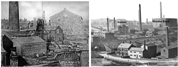 The picture on the left below shows the Holebottom Colliery, one of several mines owned by the Jones family. If the sinking of the pit in Northmoor by William Jones marked the beginning of the Jones family’s coal enterprises, this mine may well signify the beginning of the end. In most cases the mining companies didn’t own the land under which they mined. The Joneses and Leeses would lease the mining rights from the owner of the land. The Holebottom colliery was one of four pits (Rhodes Bank, Nook and Nelson being the others) run as a single entity by the Leeses & Jones Co.. These four pits stood on the Horsedge estate of Thomas Knowles MP. Following the MP’s death in May 1877, Joseph Jones (V) together with his cousins, John Joseph, William and James decided to try to purchase the land rather than coming to a lease agreement with the potential new landowner. In the auction Joseph was the highest bidder, buying the land for a sum of £3,500. Apparently the Leeses were not too pleased by this purchase and, almost immediately after the auction, sued the Joneses on the basis that water in the Rhodes Bank pit (now owned by the Joneses, but yet to have been worked by them) had been allowed to rise to such a level that it had flooded the neighbouring Nelson pit (worked by the Leeses). Ultimately, neither party seems have been a winner in the courts, and financially the Jones family were definitely losers, the Rhodes Bank pit in the 1882 Poor Rate Valuation being rated at just £50.